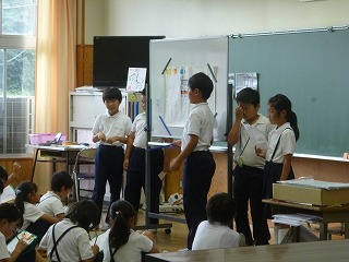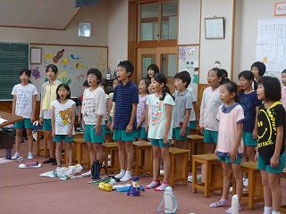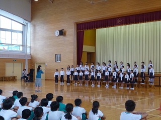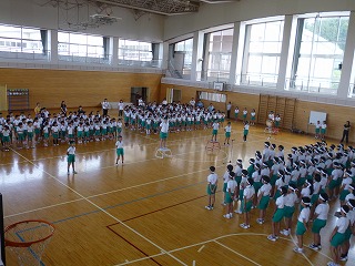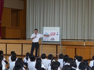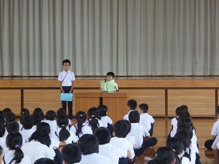 7月17日(金)第1学期の終業式が行われました。校長先生から、夏休みにしかできない体験をするようにというお話がありました。その後、代表児童による1学期の反省と夏休みの計画の発表がありました。最後に、生徒指導の先生から、4つの車「パトカー(事件・事故)」「救急車(病気・けが)」「消防車(火災)」「不審車(不審な人)」に気をつけ、乗らないように安全に過ごしましょうとの話がありました。