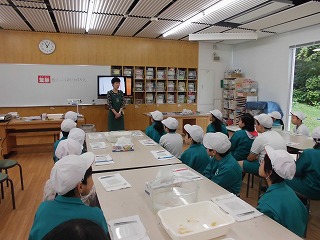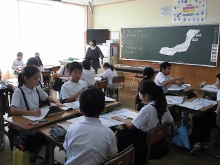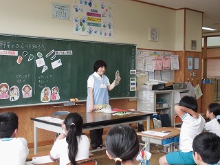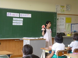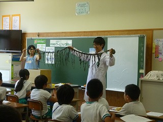 同日、3年生を対象に食育の授業が行われました。「わかめパワーを知ろう」という題で、理研の講師の方から、わかめには食物繊維があるため、体の調子を良くするということを教えていただきました。実際の3メートルもあるわかめの実物を見た子どもたちは、とても驚いていました。お昼休みに家庭科室に展示されましたが、磯のにおいが廊下まで広がっていました。