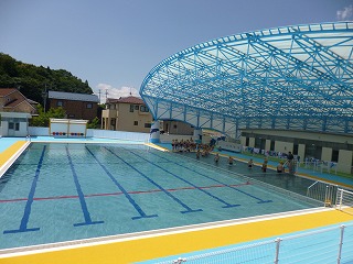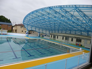 体育館で代表の児童による誓いの言葉    完成したプールです