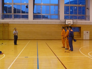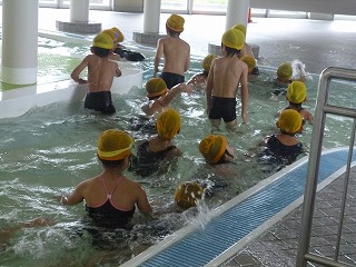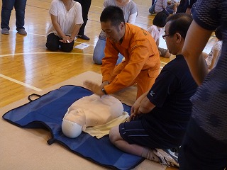 プールでの活動の前に、PTA主催の救命救助法の講習会が行われました。心肺蘇生の仕方、AEDの使い方を学習しました。