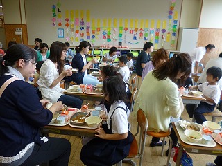 7月9日(木)、給食試食会、授業参観、PTA教育講演会が行われました。給食試食会は、1年生の保護者を対象に行われました。おうちの方と一緒に食べる給食はおいしかったようです。