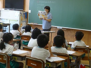 7月15日(水)、「野菜のひみつをしろう」という内容で、好き嫌いなく野菜を食べて、いいうんちを出そうというお話でした。栄養が吸収されたり、便がつくられる小腸の長さを確かめ、子どもたちは驚いていました。