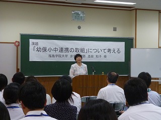 9月4日(金)、幼保小中連携研修会が本宮まゆみ小学校で行われました。授業公開の後、講演会が行われました。講師の福島学院大学非常勤講師添田和子先生から、「子どもの発達は右上がりの直線には必ずしもならず、上昇したり下降したりを繰り返すこと」「小さいうちに『失敗する』という経験を積ませること」「幼保小中連携で一番大切なことは、人と人のつながりである」というお話がありました。