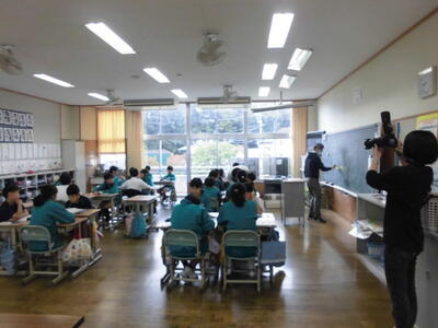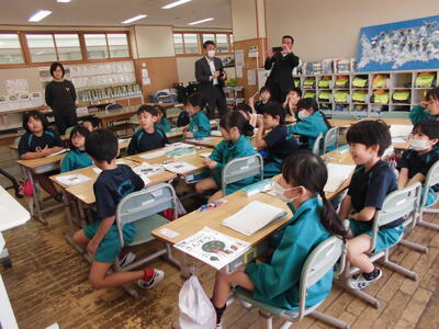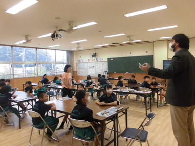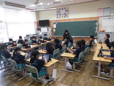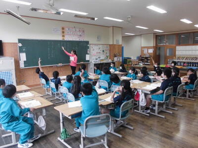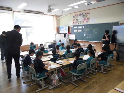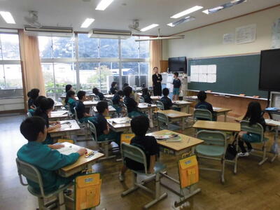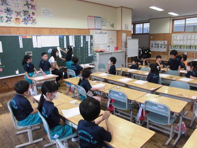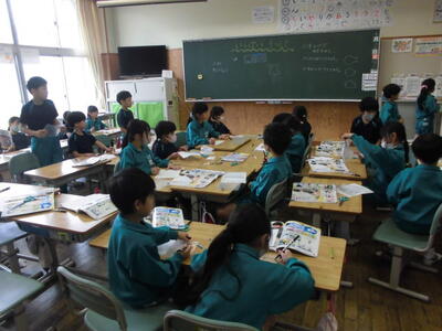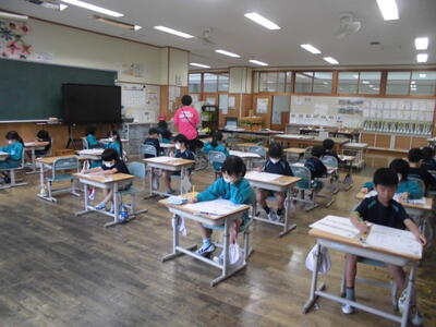 1年1組は国語科「かん字のはなし」の学習。習った漢字を用いて文を作ります。
