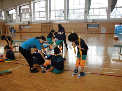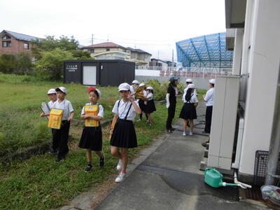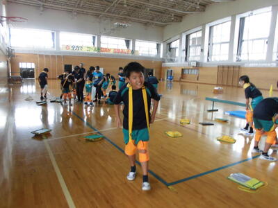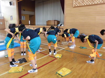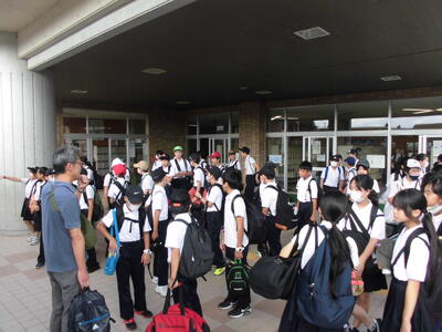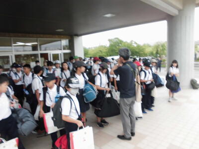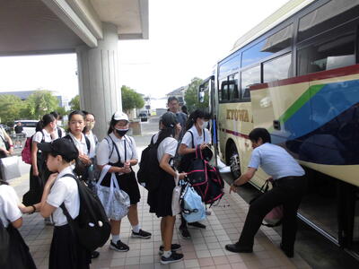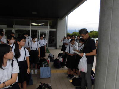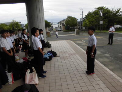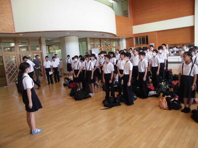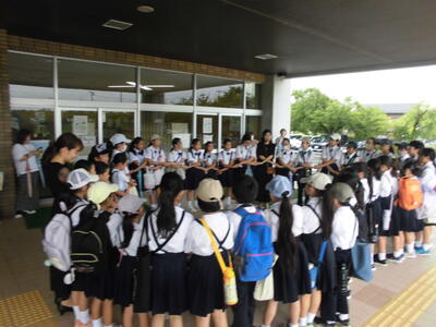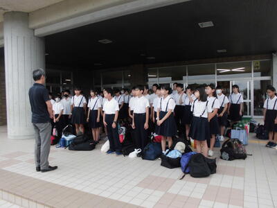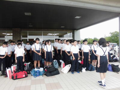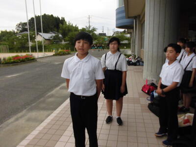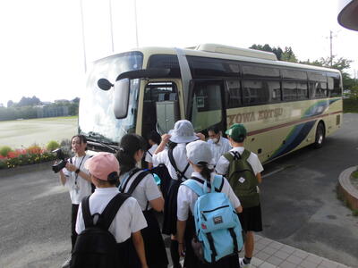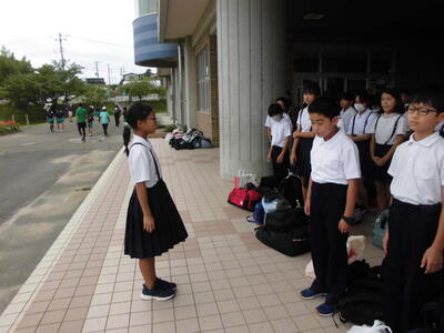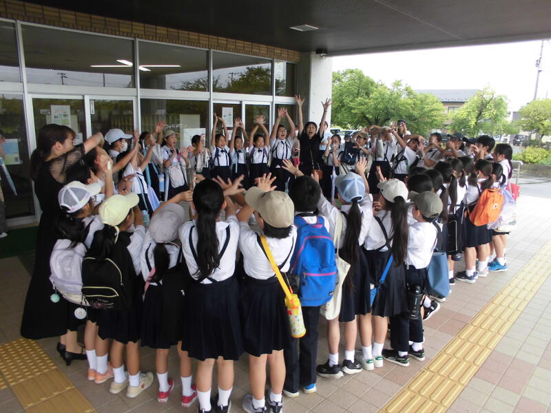 まゆみ小合唱部の子どもたちが、喜多方市で開催される「TBCこども音楽コンクール」の会場に向けて出発しました。出発前には全員で輪になって気持ちを高めました。