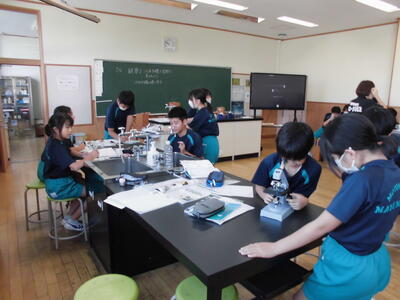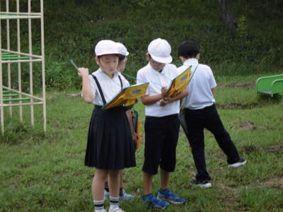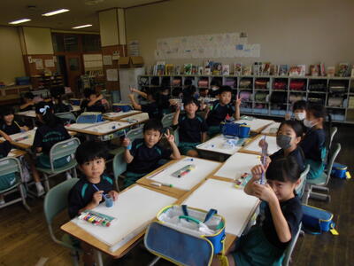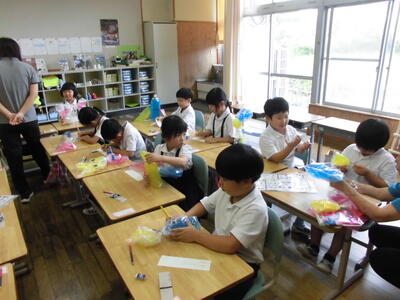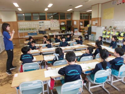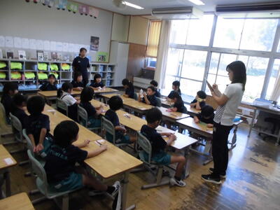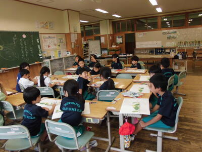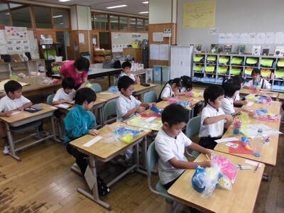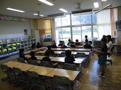 1校時 1年1組は国語科「やくそく」の学習です。二匹のあおむしの気持ちを考え合いました。