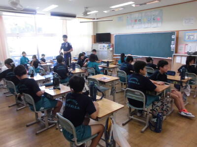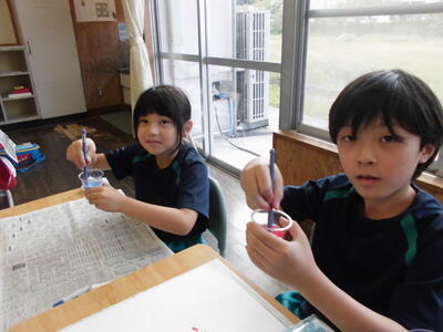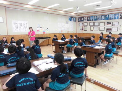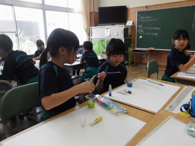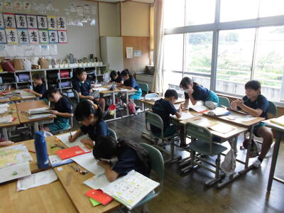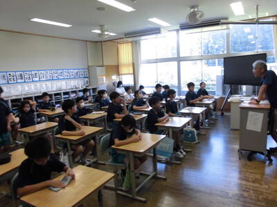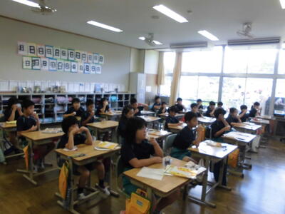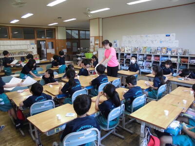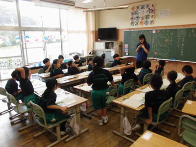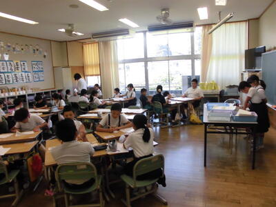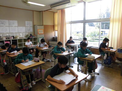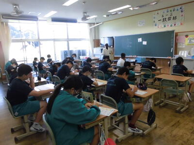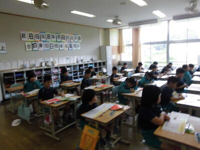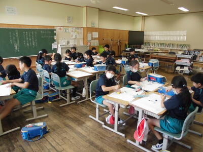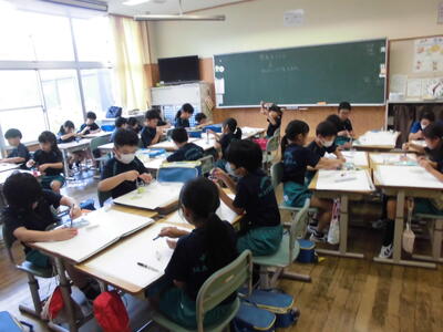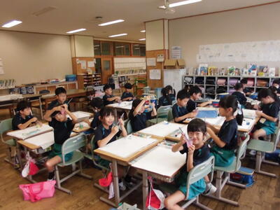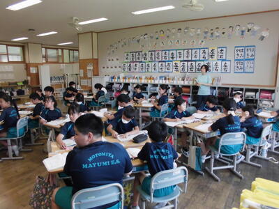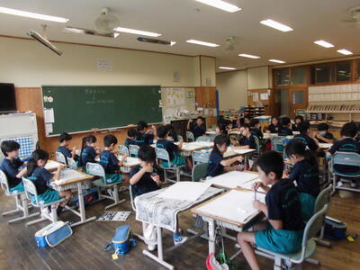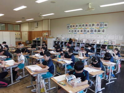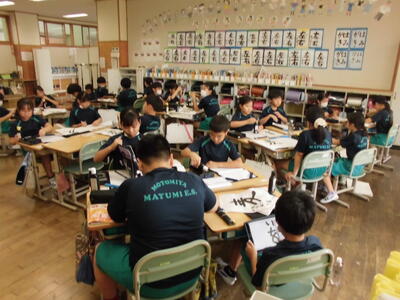 4年1組は書写。左はらいの方向に気をつけて「麦」という字を書きます。