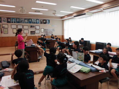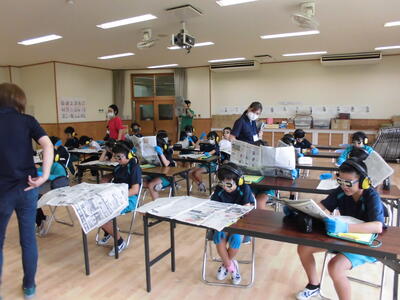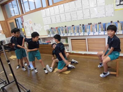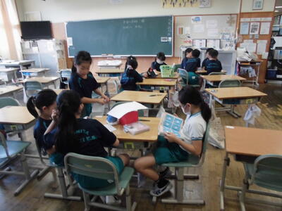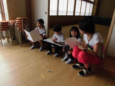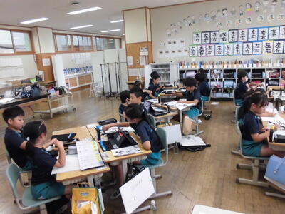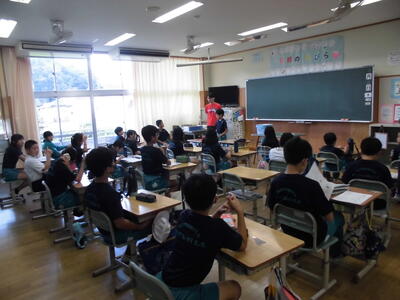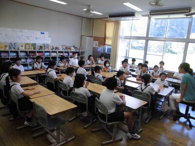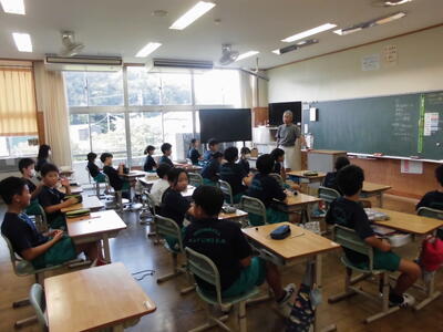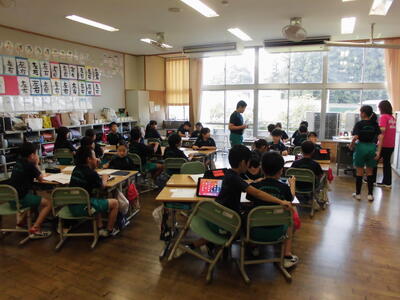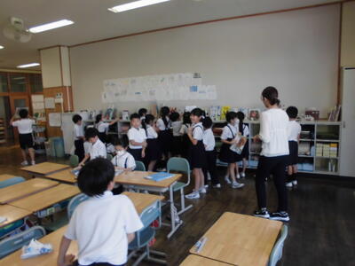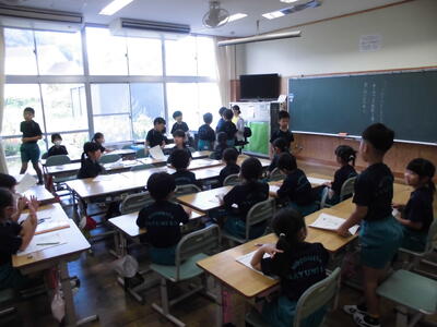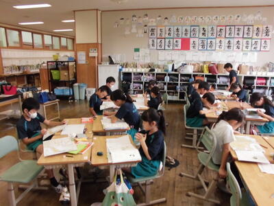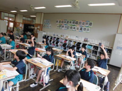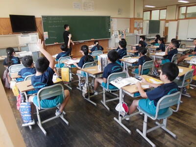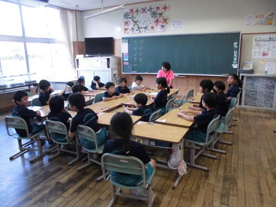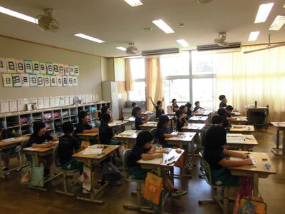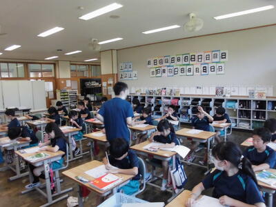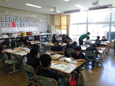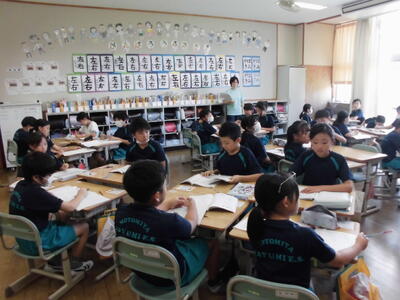4年2組は国語科。「漢字の広場」の学習。場面や出来事を考えながら昔話を完成させます。