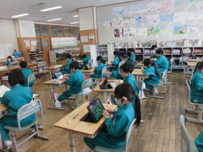 人権擁護委員4名の方をお招きし、人権教室を行いました。5年生のテーマは、「もしもこんなメッセージ(SNS)が来たら~自分も相手も大切にする伝え方~」でした。