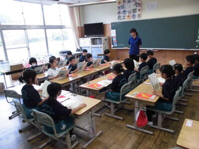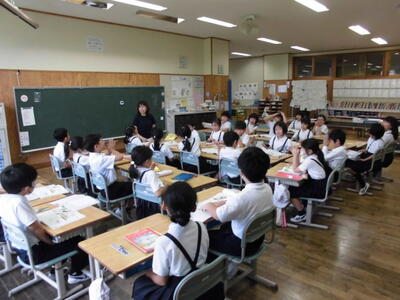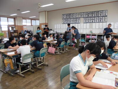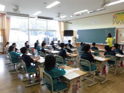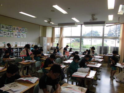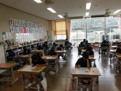 4年2組は書写。二つ並んだ「左はらい」の方向に気をつけて書いていきます。