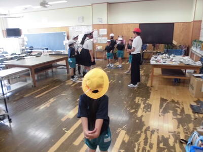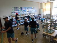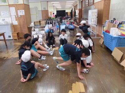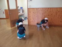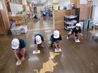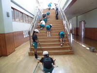 一斉清掃の様子です。廊下はワックスがけにむけて水拭きをしています。
