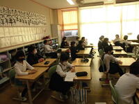 5年1組は社会科。情報通信技術を活用して広がっていくサービスについて考え合いました。