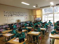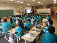 1年1組は算数科。「ひろさをくらべよう」の学習。ゲームをしながら楽しく学習しています。