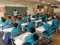 1年2組は音楽科「すすめがちゅん」の学習。音の長さを工夫して演奏します。