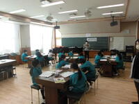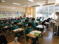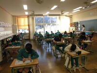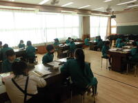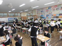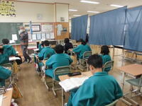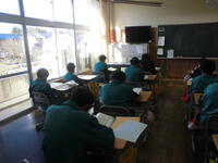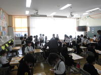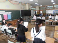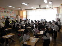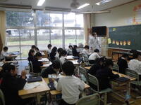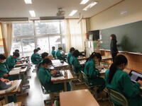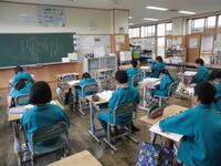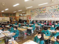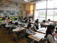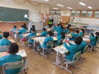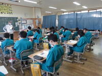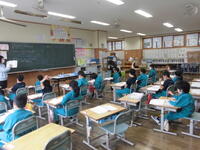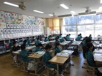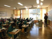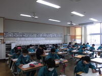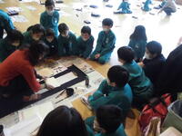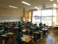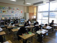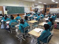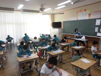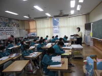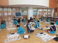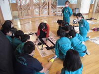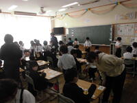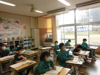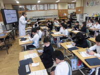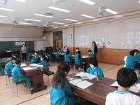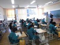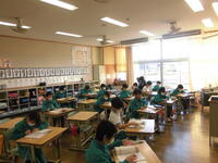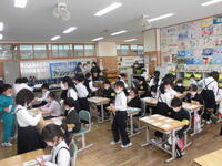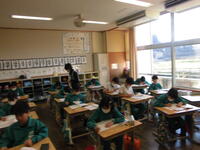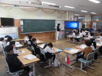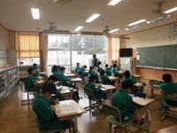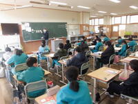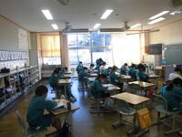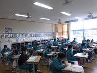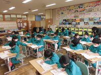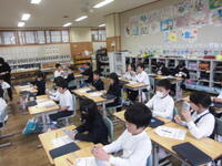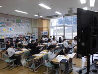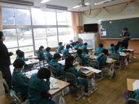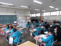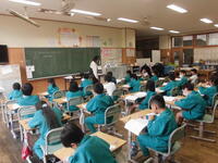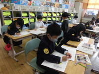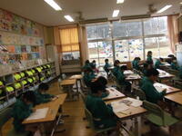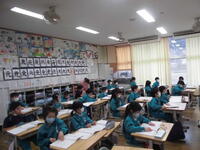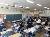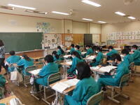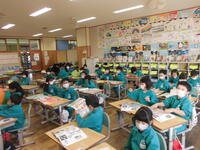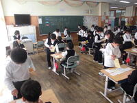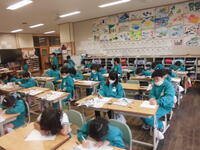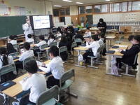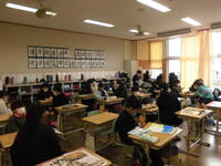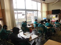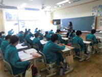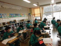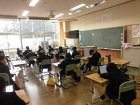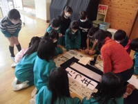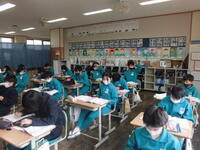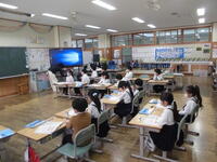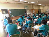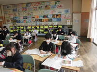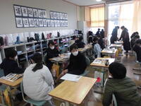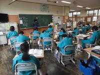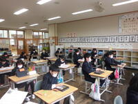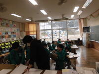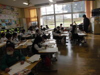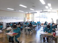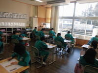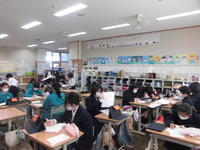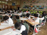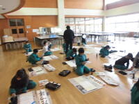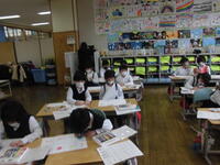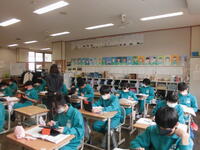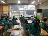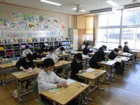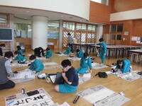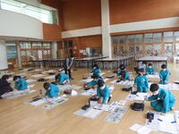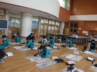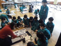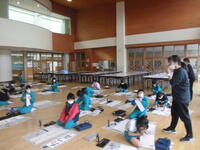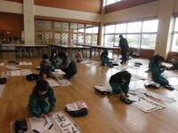 3年1組は書き初め教室です。講師の先生をお招きして姿勢や筆の運び、書くときのポイントを教えていただきました。