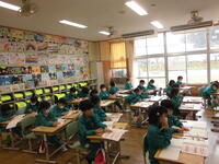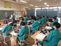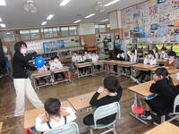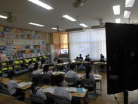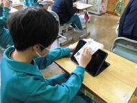 5年1組は図工「地球は大きなキャンバスだ」の学習。グループで話し合っていました。