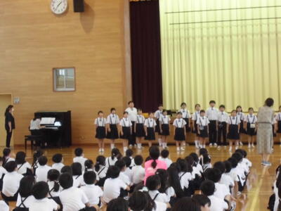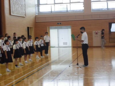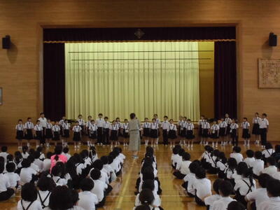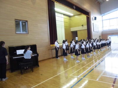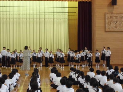 代表児童からは「多くの人の歌声を合わせるのは難しいと思いますが、毎日の練習で心を一つにがんばっていたので、すばらしい発表になったと思います。今日、初めて皆さんの歌声を聞いてとても感動しました。ぜひ、大会当日も聞いている人に感動を与える発表をめざしてください。応援しています。」