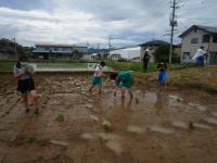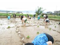 5年生は汚れても大丈夫な服装に着替え、長靴を持って田んぼへ向かいました。田植えをしたことがある子もいれば、初めての田植え体験の子もいたようです。田んぼに入ると、子ども達は泥だらけになりながら田植えをしました。泥で動きにくかったり、かがんで苗を植えるため終わった後は「大変だった」と話していました。それでも「楽しかった」と話してくれた子も多くいました。