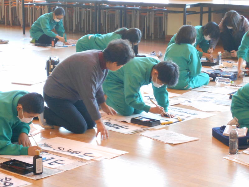 本校の3~6年生は、2週にわたって講師の先生方に「書き初め」のご指導をいただきました。今日は5年生です。題は「山里の春」。紙や下敷きの置き方、字のバランス等、きめ細かにご指導いただきました。子どもたちは皆真剣に取り組み、わずかな時間で上達が見られるようになりました。
