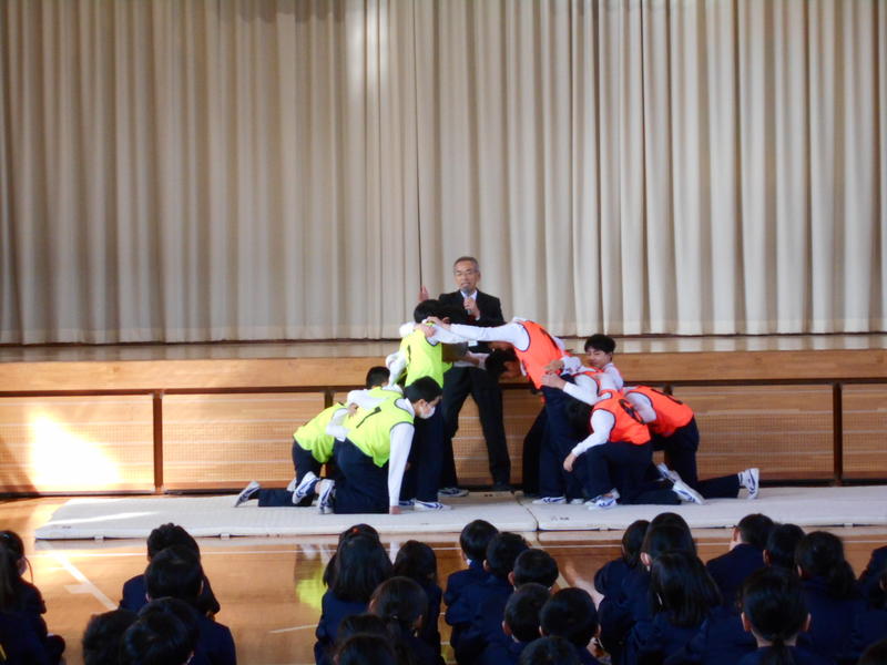 そして、今年大いに盛り上がったラグビーワールドカップの「スクラム」の模様を、6年生に協力いただきながら再現しました。全員が興味深く、そして楽しく見ることができました。スクラムは心と力を合わせた時に前進します。これからも協力することの大切さを伝えていきたいと思います。