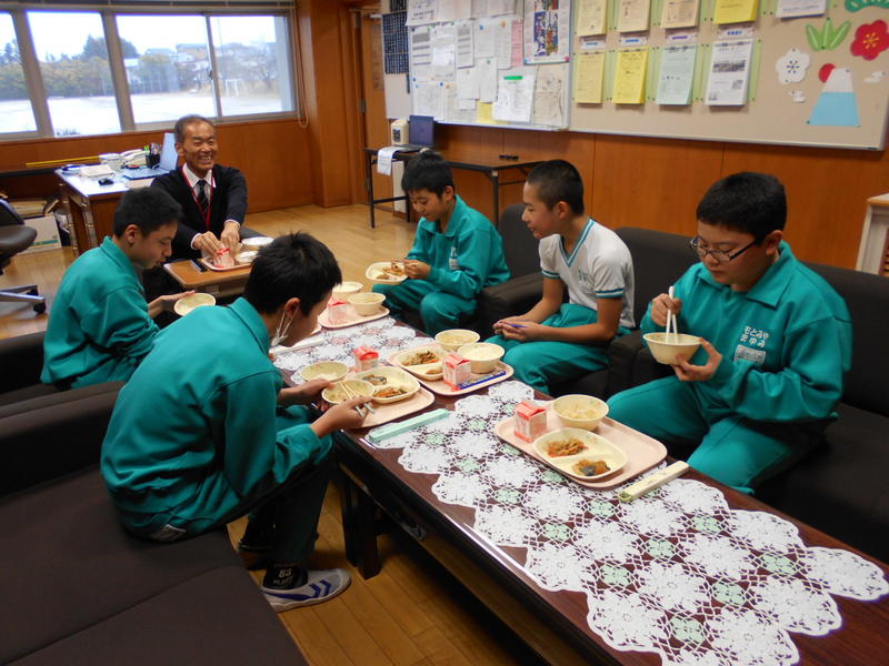 現在、6年生と校長が会食を実施しております。卒業祝いのイベントです。給食の時間に6年生が各自の給食を校長室に持参して始まります。