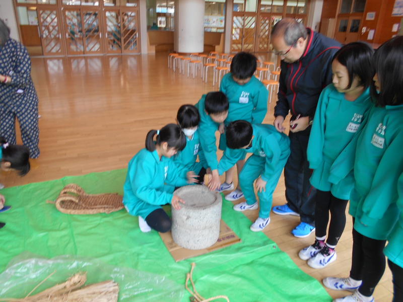 社会科で「古い道具と昔のくらし」の学習をしている3年生は、古い道具の体験教室を行いました。講師の先生に、以前の衣食住の話や道具の説明などをしていただいた際は、子どもたちにとって、初めて知ることが多く驚いた表情をしていました。また、体験する場面では、道具に興味を示しながら触れるとともに、今の生活の便利さを実感したようです。
