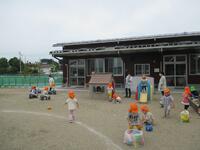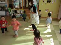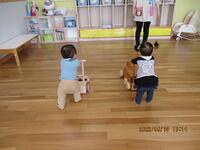 手押し車に汽車ポッポで歩く練習を楽しみました。「ぽっぽ~」と音が鳴ると嬉しそうなひよこ組さんでした。