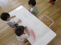 大きな紙にぐるぐる~と思いっきりお絵描きをしました。赤、青、緑、好きな色のクレヨンを手に取り楽しむひよこ組さんでした。