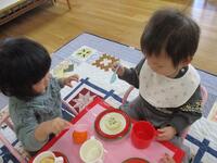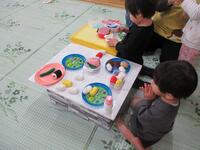 カラーお手玉を食べ物に見立てて、おままごとを楽しみました。「はいどうぞ!」「ありがとう!」やり取りも上手になりました。