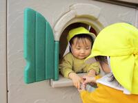 元気いっぱいなひよこ組さんはお外遊びも大好きです! 園庭にあるお家の窓から顔を出し、何やらお友達とお話し中… 気持ちは通じ合い、お互いニコニコ顔でした!