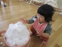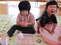 雪が積もった次の日、大きい洗面器に雪を入れ、お部屋の中に入れると大喜び! 「しろー!」「つめたーい!」など、歓声を上げながら、暖かいお部屋で、冷たい雪の感触を楽しみました。