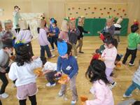 3歳さんになると、「年長さんが鬼さんになってくれている」ことがわかるようで、喜んで豆まきをすることができました。 自分達で丸めて作った新聞紙の豆を、投げては拾い、投げては拾い、繰り返し楽しんだ子ども達です!