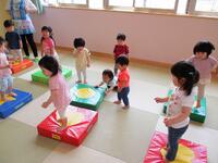 ジャンピングマットで運動遊び。ジャンプしたり、上り下りしたりして体を動かしました! 気に入った色のマットはお友達と取り合いになるほど、繰り返し楽しみました。