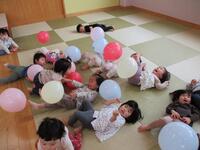 みんなで寝転んで自由に動く風船を見たり、触ったり… 大きな布に風船をのせ、子ども達の上にふわりとおろすと大喜び! たくさんの笑顔と笑い声が聞こえました! 風船遊びが大好きなうさぎ組さんです!!