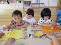 夏の壁面製作はパイナップル作りです! スポンジに絵の具をつけて、ポンポンと画用紙にスタンプしました。みんなの集中力にびっくりです。かわいいパイナップルができました!