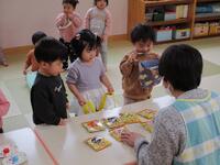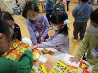 店員さん役の先生に「これ!」「ください!」とお話しながら、お店屋さんごっこを楽しみました。お菓子の袋の絵柄、コマの模様を、よーく見て自分のすきなものを選んだ子ども達。大満足の笑顔が見られました!