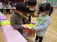 〇 0~2歳児さんには品物を届け、クラスで担任の先生とお店屋さんごっこを楽しみました。3・4歳児さんは、遊戯室にて、年長さんのお店でお買い物ごっこを楽しみました。 本当に優しく、丁寧な接客をしてくれた年長組さん。お買い物に来た3・4歳児さんは大喜び! 喜んでもらった5歳児さんも大満足の活動になり、達成感を味わうことができました。