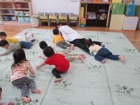 18人中、5人が0歳児からの進級児、13人が新入所、転所のお友達でスタートしたうさぎ組さん。4月当初は泣き声の大合唱… 初めてお家の人から離れたお友達と、新しい環境になったお友達、みんな不安で朝は涙、涙、の日々でしたが、少しずつ環境に慣れ、担任の先生と、お友達と一緒に過ごす保育所が安心して過ごせる場所となりました。今ではおしゃべりも楽しく、お友達とやり取りをしながらごっこ遊びをしたり、かけっこやダンス、体操をして体を動かしたり、元気いっぱい笑顔いっぱいのうさぎ組さんです。
