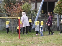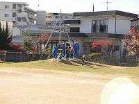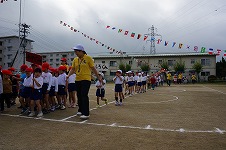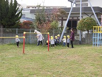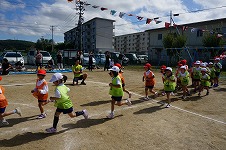 つき組さんは、戸外でお兄さんお姉さんとかけっこ競争をしました。