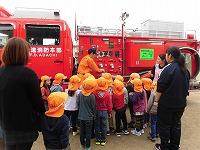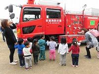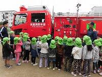 「かっこいいね」と消防車を眺める、にじぐみさんと