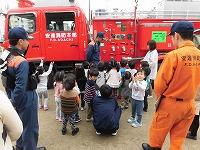 興味津々で、消防士の方から消防車の説明を聞いている