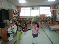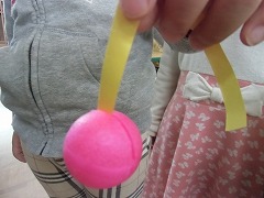 2歳児クラスの羽子板遊び風船に当てようと夢中です。