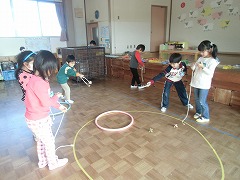 年長組のこま廻し。ねらって、ねらって、輪の中へ投げ入れます。