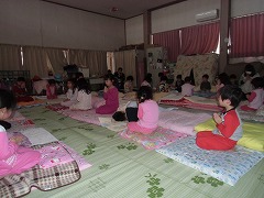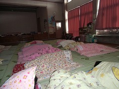 避難訓練の後の先生からのお話の姿 お昼寝の時間に地震がきました。(3月11日)