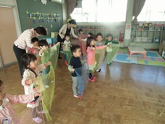 3歳のクラスではふわふわのスカーフをふわり、ふわり。これで拍をとります。