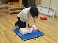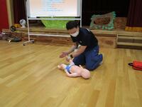 安達地方広域行政組合消防本部の方にお越しいただき、保育所内でけが人や急病人が発生した場合、職員が「救命処置」を行えるよう、心肺蘇生やAEDの使用方法を学びました。