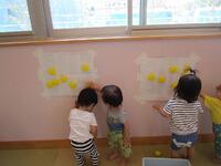 星の形のボールを貼りました。剥がしたり、付けたりする遊びを楽しみました。