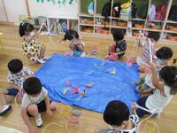 タライを使っての水遊びです。ペットボトルのじょうろや水鉄砲を使って遊び、大はしゃぎの子ども達でした。水遊びの準備や後始末も、回数を重ねるごとにスムーズにできるようになりました。