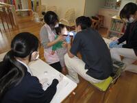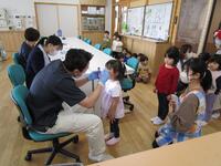 そら組、つき組、ほし組さんは職員室で歯科検診をしました。口を大きくあけて診ていただきました。