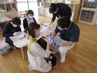 製作ではカエルのカスタネットを作りました。折り紙をちぎって貼ったり、目や口をかわいらしく描いたりしました。完成すると、鳴らして楽しみました。